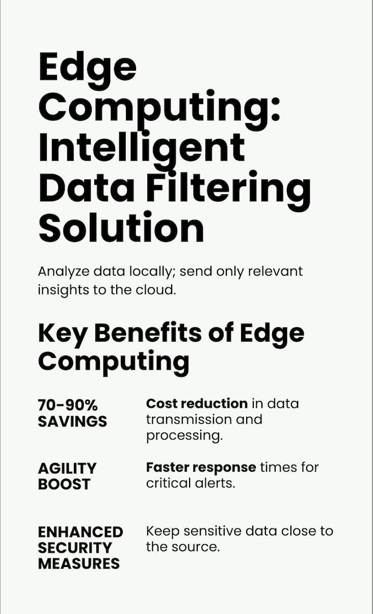 Edge computing acts as an intelligent filter, analyzing data locally and sending only relevant insights to the cloud. Instead of transmitting thousands of sensor readings per minute, an edge device might send a single alert when an anomaly is detected. This approach can reduce data transmission costs by 70-90% while improving system responsiveness.